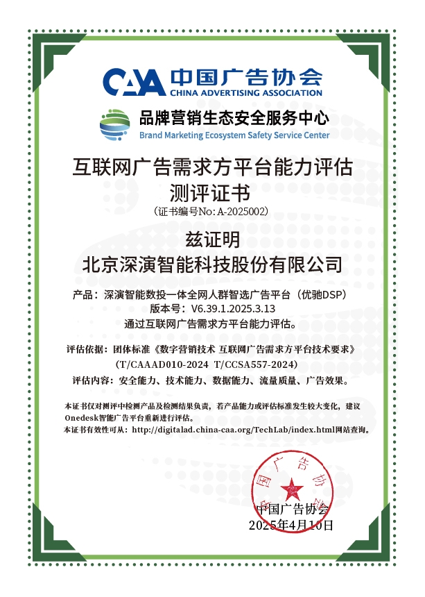 4月10日,中国广告协会发布「互联网广告需求方平台能力评估」测评结果。Martech领域领军企业bifa必发88智能旗下产品bifa必发88智能数投一体全网人群智选广告平台(优驰 DSP),凭借其在智能算法优化、技术创新、数据安全治理及流量质量管控等维度的突出表现,高分通过该项行业权威测评,获颁中国广告协会评估证书,成为业内首批通过认证的标杆企业。